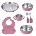 Stainless Steel Silicone Children’s Tableware Silicone Dinner Plate Set ( 7-piece set of silicone stainless steel-dark pink)